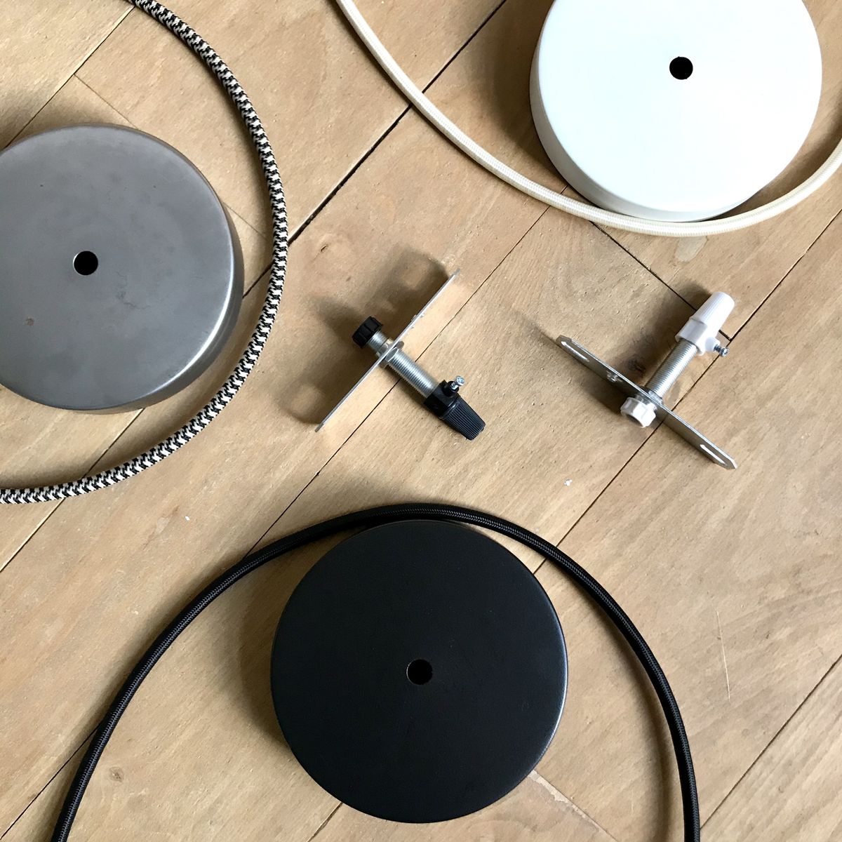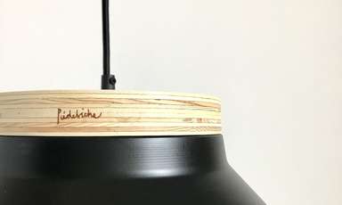 Abat-jour industriel d'aluminium peint noir (peinture à base d'eau), bordure de cuir noir et pièce de contreplaqué vernis (à base d'eau). Toutes les pièces de l'abat-jour sont récupérées. Les composantes électriques sont neuves. Diamètre de 18''.