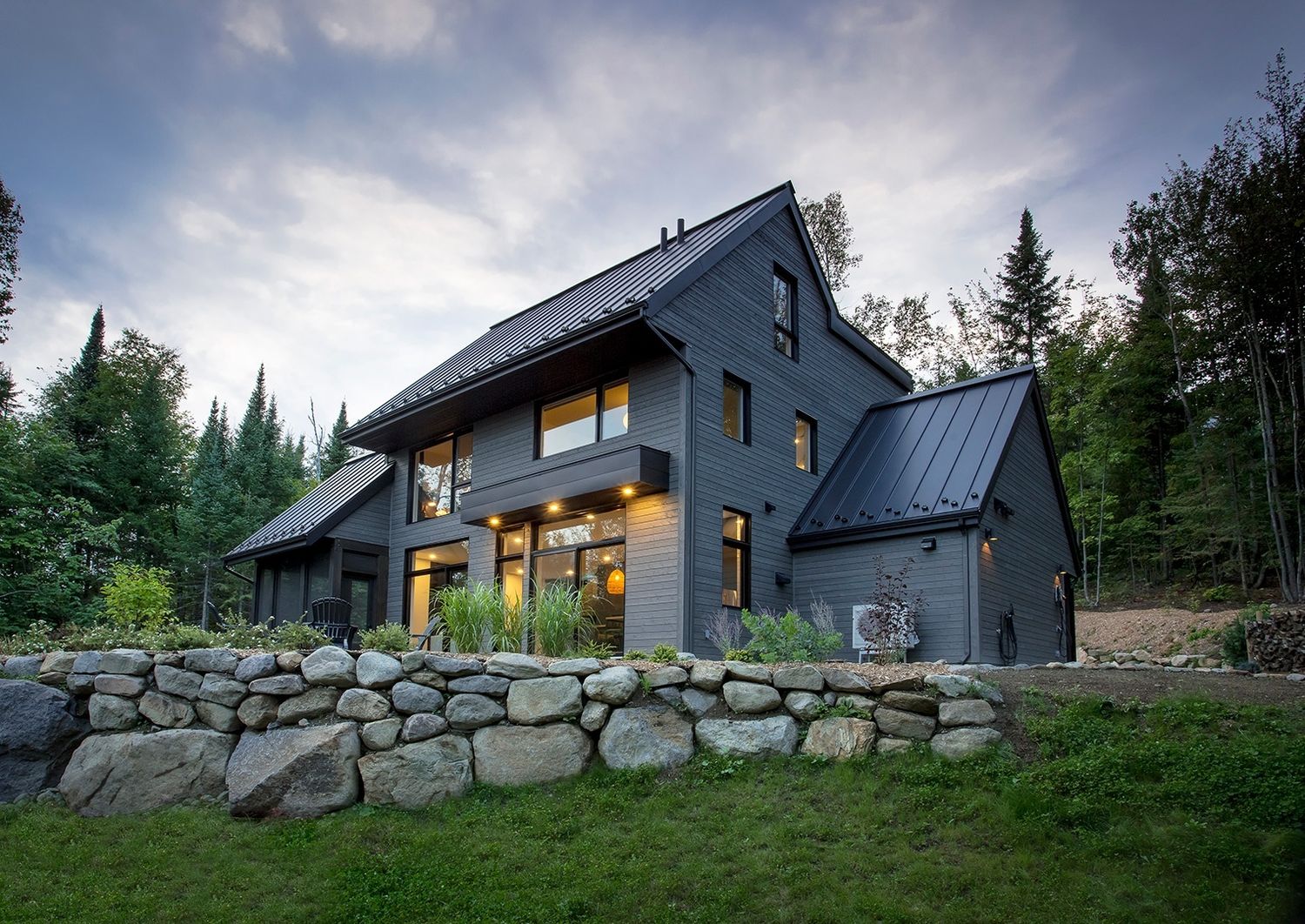 Construite au sommet du mont Chanteclerc à Sainte-Adèle, la Maison Écohab a été conçue comme résidence familiale pour une famille passionnée de plein air et de sports de montagne. D’une superficie de 1 600 pi² sur deux étages, elle comprend également 300 pi² supplémentaires aménagés dans les fermes de toit, où se trouvent une salle d’entraînement et de musique — une façon ingénieuse et économique de maximiser l’espace habitable.