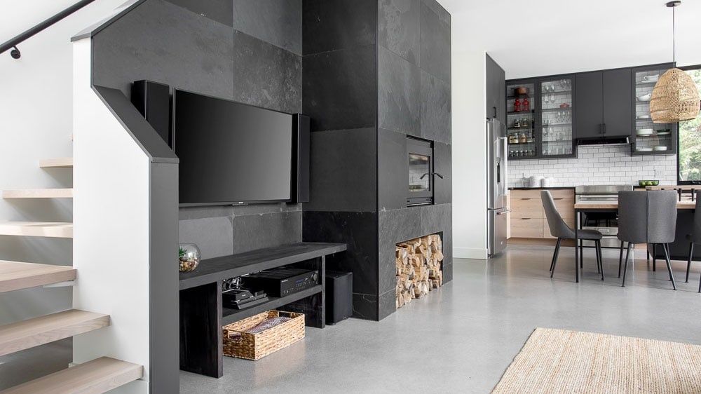 Le chauffage et la climatisation sont assurés par une thermopompe bi-bloc, avec une tête murale par étage. Un foyer au bois homologué EPA trône au cœur de la zone de vie. Parmi les choix durables : une toiture en acier, des fenêtres tout aluminium et hybrides à triple vitrage, pour un confort optimal en toute saison.