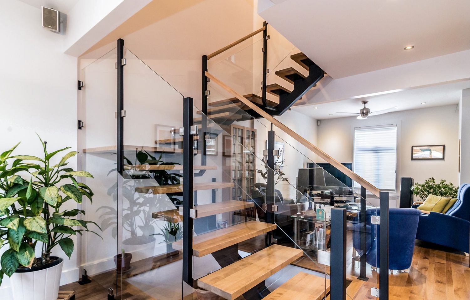 Nous avons ajouté cet escalier central transparent dans le cadre d’une conversion de duplex en cottage. Composer de bois, d’acier et de verre, cet escalier est devenu l’élément architectural central de cette rénovation.