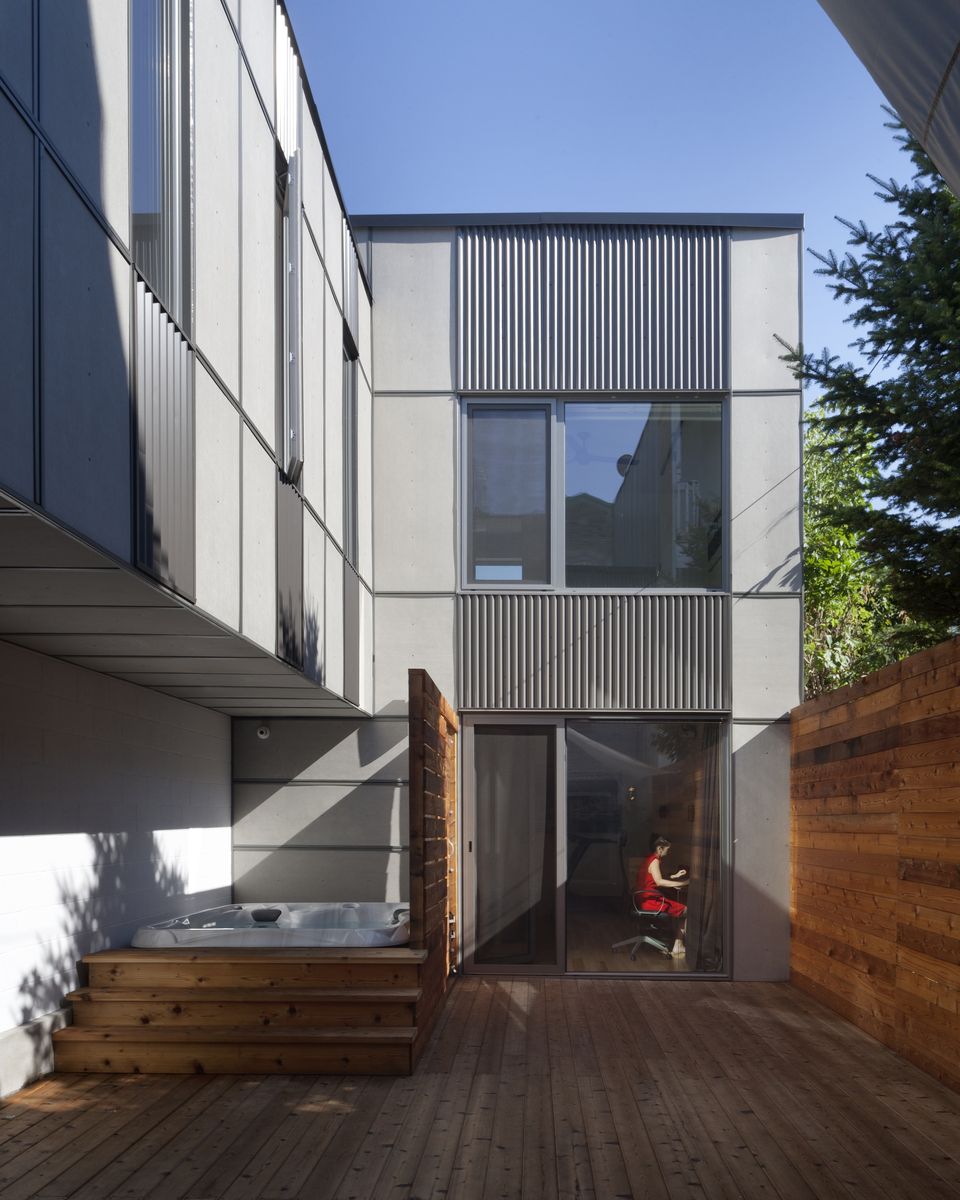 Un agrandissement qui augmente l’intimité Pour préserver l’intimité des lieux, un agrandissement a été construit dans la cour et fut relié à la maison existante par une passerelle au deuxième étage. Une haute clôture de bois latérale a aussi préservé l’intimité de la cour.