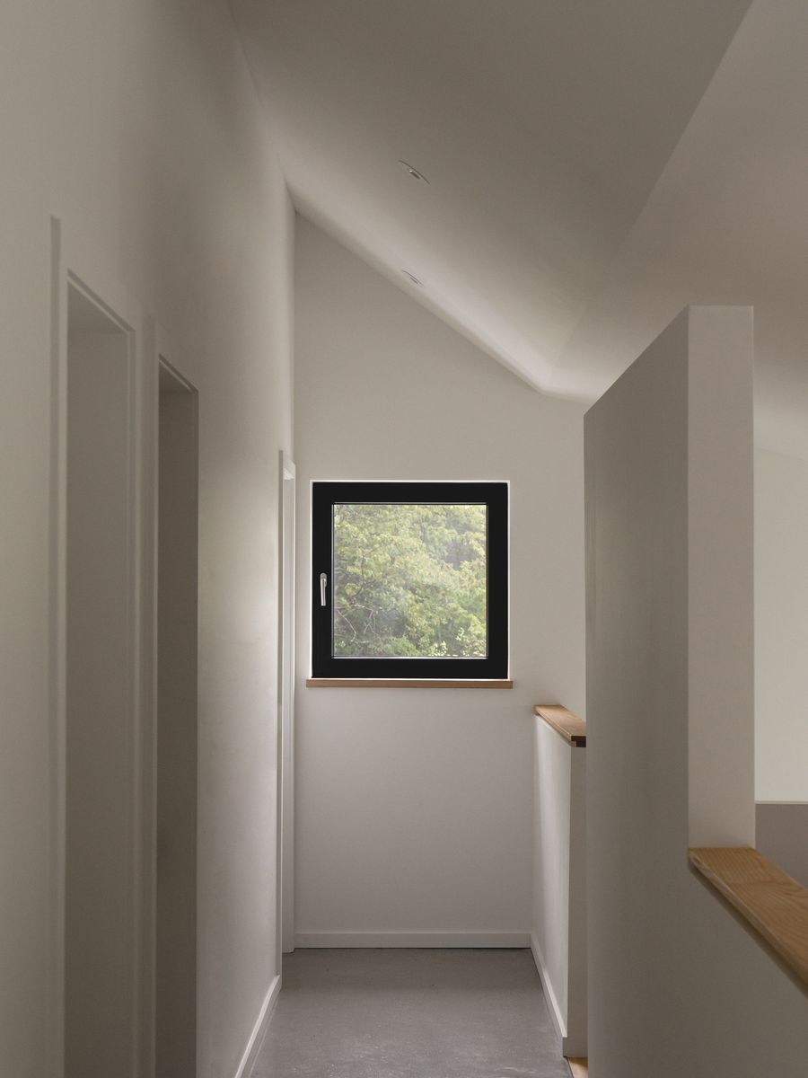 La volumétrie de la maison s’inspire de la typologie historique « Saltbox », très répandue en Estrie et en Nouvelle-Angleterre, et rappelle le patrimoine bâti de la région. Le plan en « L » est orienté plein sud pour favoriser le chauffage solaire passif et les vues panoramiques sur la vallée. En construisant en rez-de-jardin la partie arrière du niveau principal, et en optant pour une pente de toit qui suit celle du terrain, la maison épouse la topographie du lieu et reste discrète de la rue. La construction sur trois niveaux en paliers, creusés dans la montagne, permet quant à elle de minimiser le plus possible les murs de soutènement visibles du chemin. Les matériaux utilisés sont simples et durables : les murs de soutènement sont construits avec la pierre d’excavation, le revêtement principal est en bois peint blanc et la section de l’entrée est en cèdre brûlé.