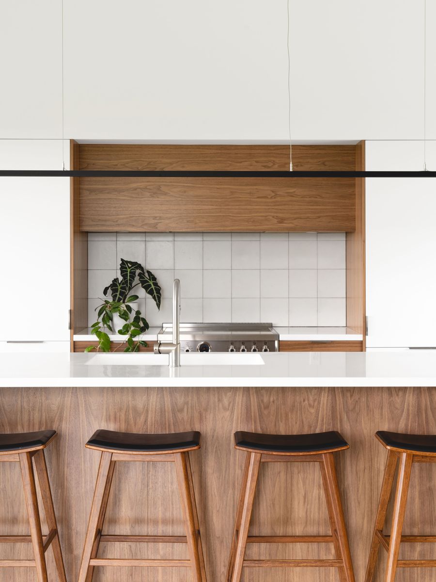 À l’intérieur, les espaces de jour sont organisés autour du bloc central qui regroupe le mudroom, la cuisine, le garde-manger et la salle d’eau. Le volume blanc s’appuie sur le corridor du 2e étage qui dessert les chambres et le petit boudoir.