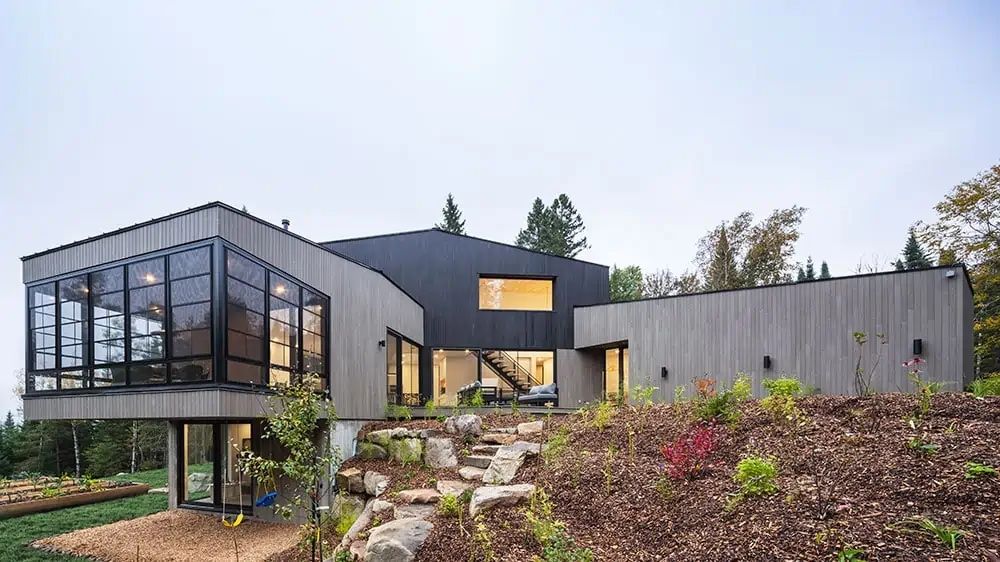 ll y a de ces projets qui par leur envergure et leur complexité marquent le parcours d’un constructeur, la résidence Sainte-Agathe en fait partie. D’abord, la maison comporte deux imposantes sections en porte-à-faux, soit la véranda moustiquaire au rez-de-chaussée et la chambre des maîtres à l’étage. Cela saisit le visiteur dès les premiers contacts, ce sont littéralement deux pièces « perchées » dans les airs. Ensuite, comportant 4420 pc sur trois étages, l’imposante résidence s’articule autour d’une vaste aire ouverte centrale à partir de laquelle se déploient deux ailes. Cela donne une volumétrie de maison assez loin de l’architecture résidentielle typique. De la coordination d’avant projet jusqu’aux derniers travaux de construction, Écohabitations boréales s’est investit dans plus d’une année de travail pour réaliser le projet.