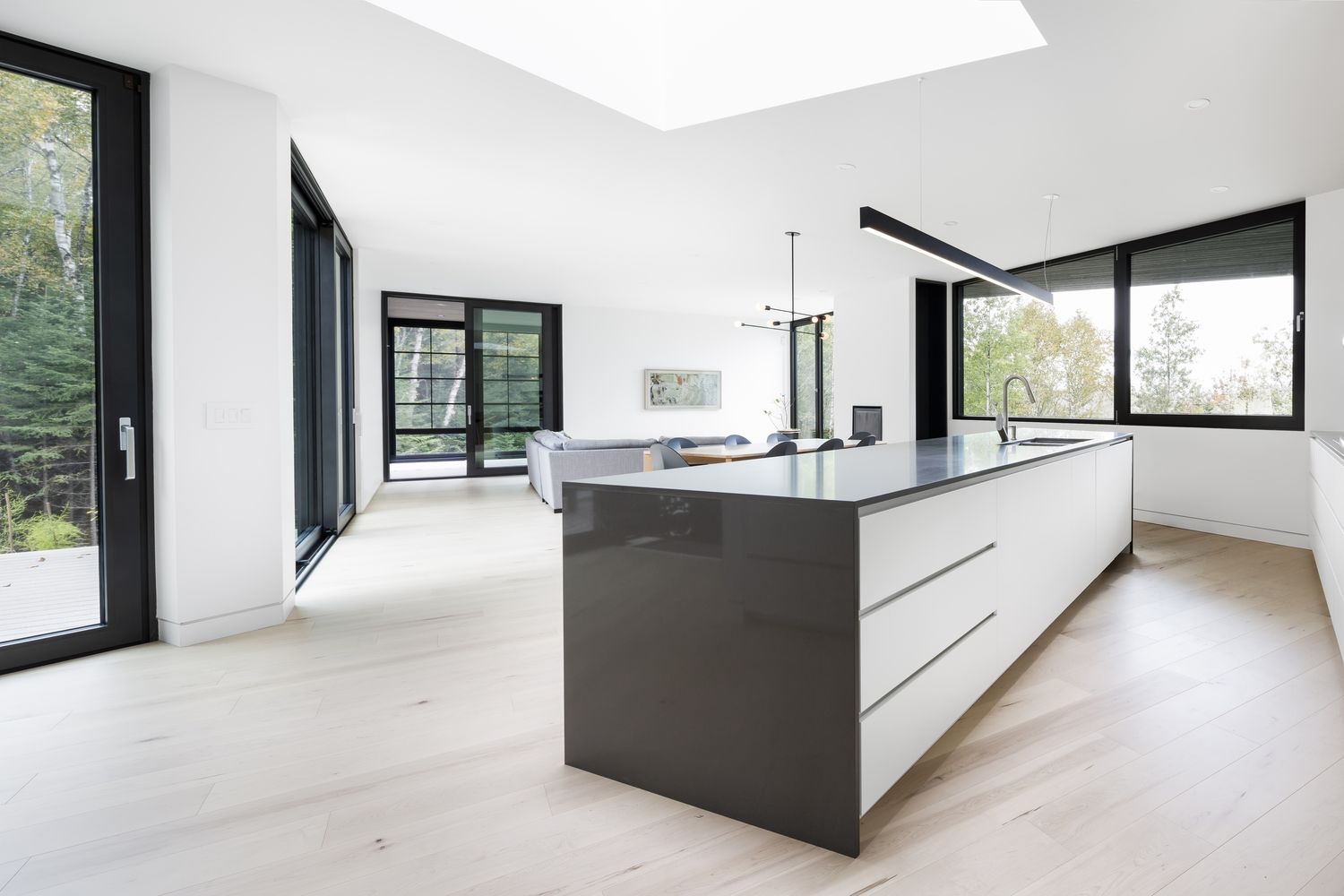 ll y a de ces projets qui par leur envergure et leur complexité marquent le parcours d’un constructeur, la résidence Sainte-Agathe en fait partie. D’abord, la maison comporte deux imposantes sections en porte-à-faux, soit la véranda moustiquaire au rez-de-chaussée et la chambre des maîtres à l’étage. Cela saisit le visiteur dès les premiers contacts, ce sont littéralement deux pièces « perchées » dans les airs. Ensuite, comportant 4420 pc sur trois étages, l’imposante résidence s’articule autour d’une vaste aire ouverte centrale à partir de laquelle se déploient deux ailes. Cela donne une volumétrie de maison assez loin de l’architecture résidentielle typique. De la coordination d’avant projet jusqu’aux derniers travaux de construction, Écohabitations boréales s’est investit dans plus d’une année de travail pour réaliser le projet.