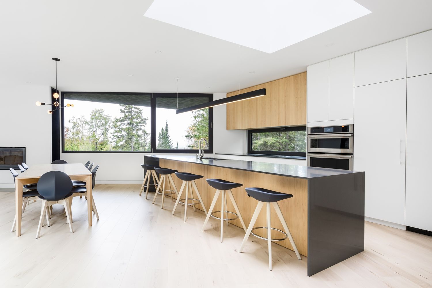 ll y a de ces projets qui par leur envergure et leur complexité marquent le parcours d’un constructeur, la résidence Sainte-Agathe en fait partie. D’abord, la maison comporte deux imposantes sections en porte-à-faux, soit la véranda moustiquaire au rez-de-chaussée et la chambre des maîtres à l’étage. Cela saisit le visiteur dès les premiers contacts, ce sont littéralement deux pièces « perchées » dans les airs. Ensuite, comportant 4420 pc sur trois étages, l’imposante résidence s’articule autour d’une vaste aire ouverte centrale à partir de laquelle se déploient deux ailes. Cela donne une volumétrie de maison assez loin de l’architecture résidentielle typique. De la coordination d’avant projet jusqu’aux derniers travaux de construction, Écohabitations boréales s’est investit dans plus d’une année de travail pour réaliser le projet.