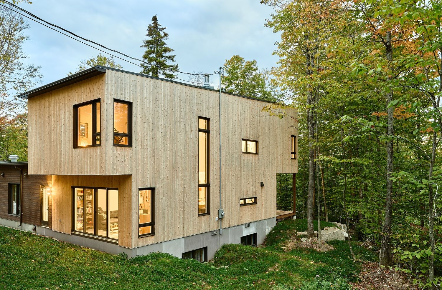 Cette magnifique maison est située en banlieue de Québec, à Stoneham-et-Tewkesbury. Conçue en respect des principes du design solaire passif, cette habitation maximise les gains solaires et permet l’accumulation de chaleur dans la masse thermique de la chape de béton en hiver. Avec son revêtement extérieur en bois et son enveloppe performante, la maison est aussi certifiée Novoclimat.