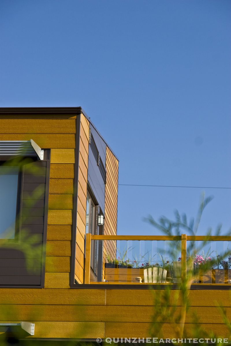 Travaillant de près avec les clients qui désiraient avoir une section à étage pour la jeune famille et une section de plain-pied pour les grands-parents, Quinzhee a proposé un plan original qui permet de conserver l'intimité tout en favorisant la proximité des familles. Côté design écologique, en tablant sur une grande fenestration qui fait face au sud, la firme a aussi su optimiser le design pour maximiser les gains solaires passifs en hiver tout en évitant la surchauffe estivale grâce à des pares soleils, une terrasse et une pergola.
