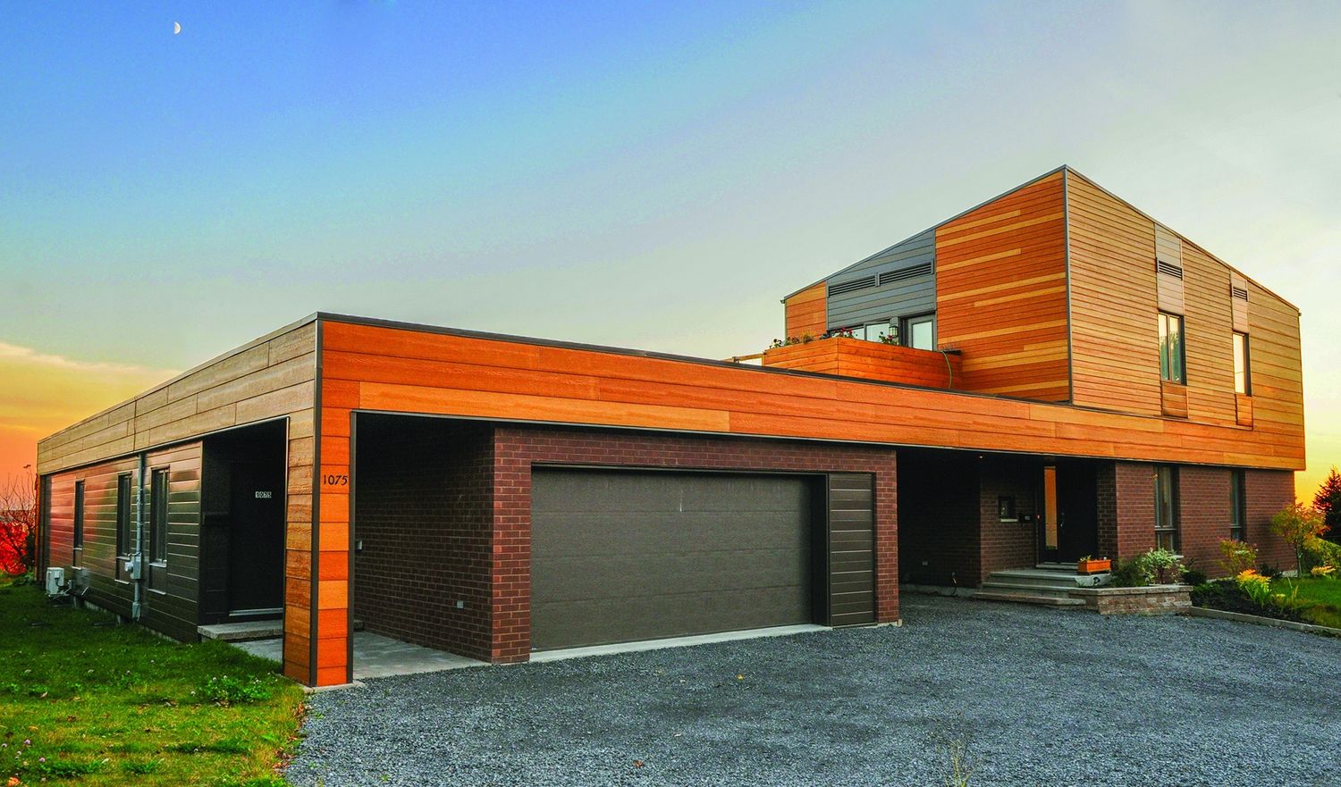 Travaillant de près avec les clients qui désiraient avoir une section à étage pour la jeune famille et une section de plain-pied pour les grands-parents, Quinzhee a proposé un plan original qui permet de conserver l'intimité tout en favorisant la proximité des familles. Côté design écologique, en tablant sur une grande fenestration qui fait face au sud, la firme a aussi su optimiser le design pour maximiser les gains solaires passifs en hiver tout en évitant la surchauffe estivale grâce à des pares soleils, une terrasse et une pergola.