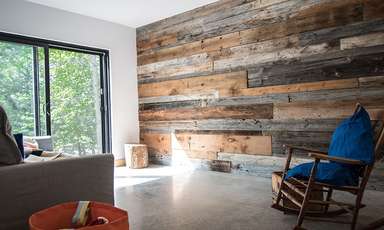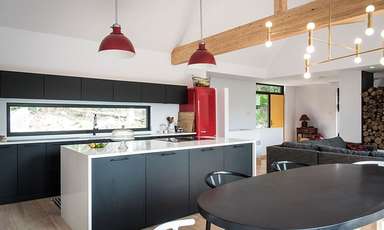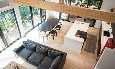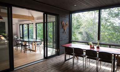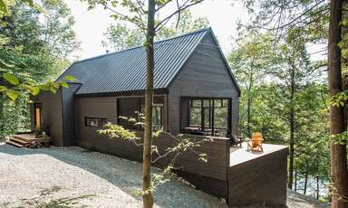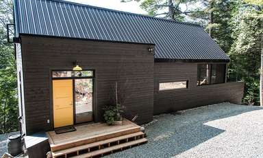 Conçu en forme rectangulaire pour bien s’implanter sur le terrain escarpé, on y compte 1800 p.c. sur deux étages avec une grande aire ouverte au rez-de-chaussée et trois chambres au rez-de-jardin. La façade sud abondamment fenêtrée offre une vue spectaculaire sur le lac William et les montagnes avoisinantes. La toiture d’acier et la porte colorée dynamisent les lignes épurées de la maison.