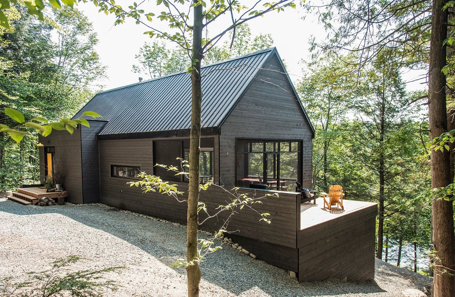 Conçu en forme rectangulaire pour bien s’implanter sur le terrain escarpé, on y compte 1800 p.c. sur deux étages avec une grande aire ouverte au rez-de-chaussée et trois chambres au rez-de-jardin. La façade sud abondamment fenêtrée offre une vue spectaculaire sur le lac William et les montagnes avoisinantes. La toiture d’acier et la porte colorée dynamisent les lignes épurées de la maison.