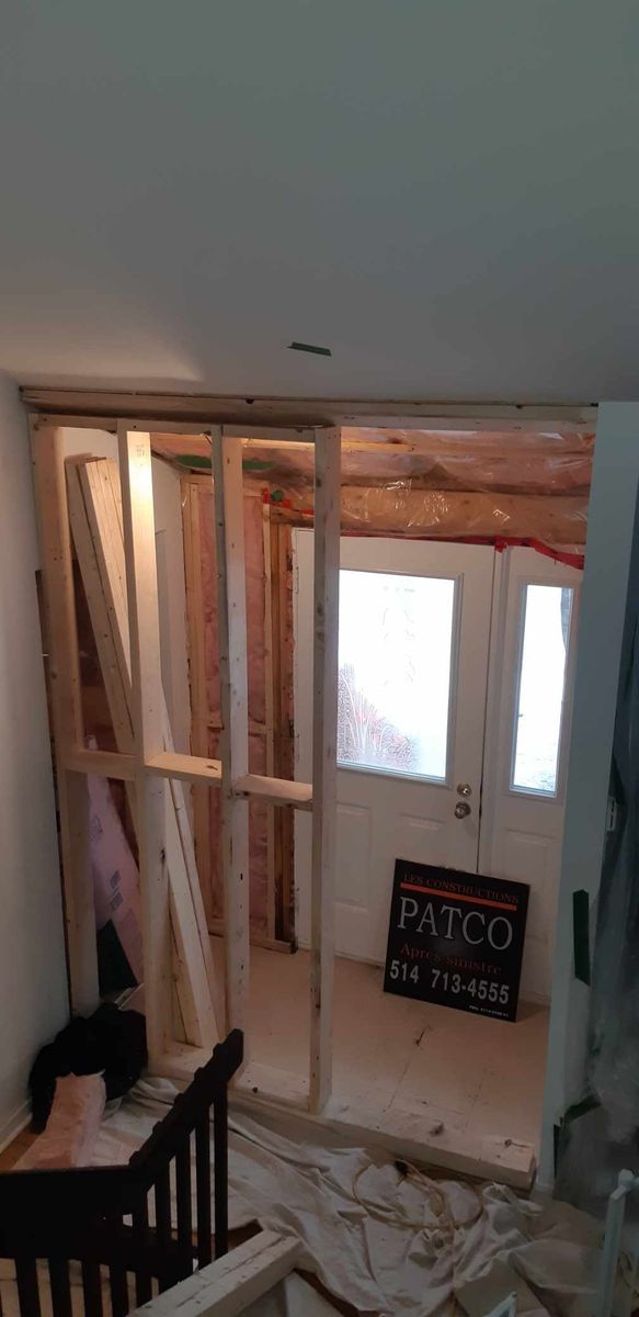 sur ce projet l'infiltration d'eau a déterioré le mur extérieur ( mur nin , solive de rive, ainsie que le mur adjancent a la toiture. Les travaux ont été réaliser dans deux chambre, espace de rangement sous l'entré ainsie que le garde robe de l'entré principale. la structure du batiment a été soutenu a partire de la dalle du sous sol dans le but de suporter les deux section de chevron de la toiture une étant cathédrale l'autre horizontale. la particularité de ce projet est la présence de revêtement d'agréga a l'extérieur. les travaux ont été réaliser sans endommager le revêtement , toiture ainsie que les portes et fenêtres. Ce projet est un autres belle exemple ou l'environement et le budget ont été bien servie !