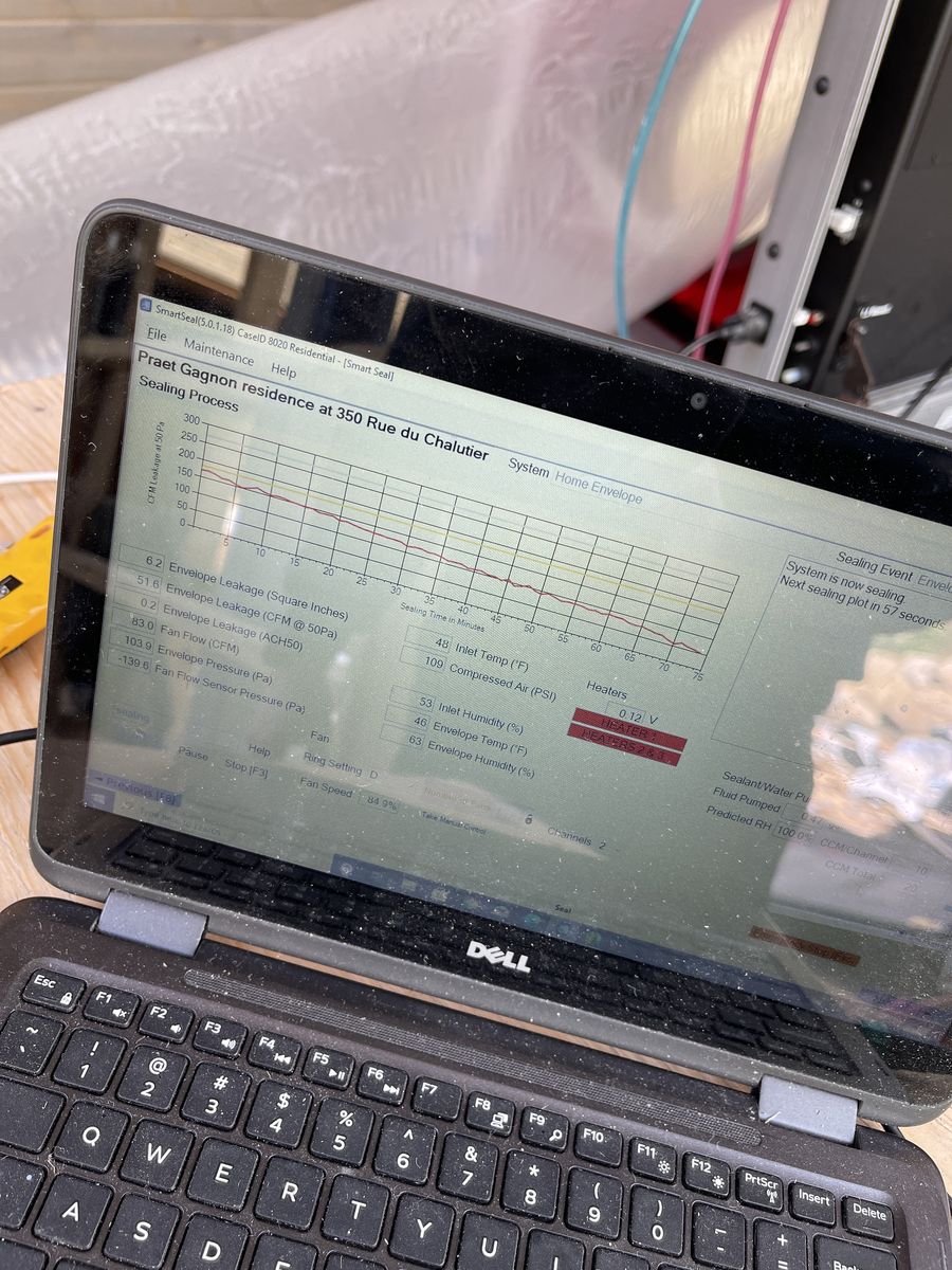 Avec nos équipements, nous avons pulvérisé notre scellant en étant gazeux dans l'enveloppe du bâtiment. En pressurisant l'enveloppe, notre scellant va colmater toutes les fuites dans l'enveloppe.