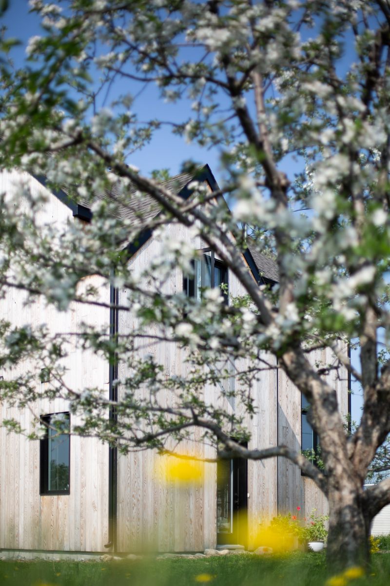 Bienvenue dans le cocon familial des Lacroix-Durocher, cette réalisation certifiée LEED accueille aujourd’hui les cinq membres de la famille. C’est avec beaucoup de confiance envers notre équipe que cette maison a été conçue à distance avec les deux propriétaires travaillant au nord du Québec. La disposition de la maison a été pensée avec soin tout en respectant le terrain et le pommier bien mature qui s’y trouvait. Les deux étages de la maison abritent trois chambres, deux salles de bain et une dalle de béton comme plancher chauffant afin de bien convenir au tout petit se promenant à quatre pattes. Le tout construit avec des matériaux nobles et dans une optique minimaliste et scandinave, nous pouvons retrouver plusieurs éléments qui rappellent cet esthétisme, dont les garde-corps des escaliers qui ont été dessinés et réalisés afin de convenir parfaitement à l’atmosphère de ce nid douillet. Pour accompagner le tout, la maison a une vue exceptionnelle sur un champ avec coucher de soleil, et ce à quelques minutes de la ville, dans un quartier résidentiel.