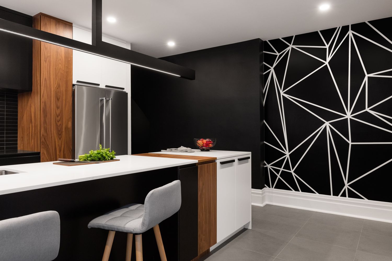 On devait imaginer un espace fonctionnel à l’image de nos clients, des passionnés de cuisine qui travaillent à la maison, et combler leur désir d’annexer la chambre principale à une salle de bain très design. En plus de l’état vétuste du condo, on devait tenir compte du logement d’en dessous qui était aussi en rénovation. La collaboration était nécessaire pour assurer un processus fluide.