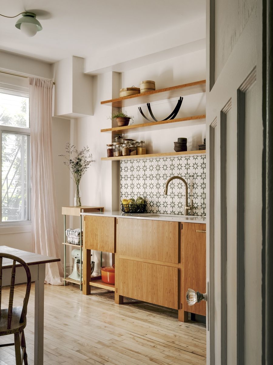 La maison de design d’intérieur Fauves a eu pour mission de rénover la cuisine d’un couple d’artistes habitant un duplex du quartier Villeray. Pour repenser cet espace peu fonctionnel, sombre et peu invitant, la designer a misé sur l’artisanat local et des aménagements simples et efficaces qui donnent au projet son cachet et son caractère atemporel. La pièce maîtresse de cette rénovation est sans aucun doute son mobilier dont l’esprit est inspiré de la table de travail de l’artisan, robuste et rustique. Le résultat n’en est pas moins élégant grâce à l’utilisation de matériaux haut de gamme : les modules de bois en cerisier massif, le dosseret chic et classique en carreaux de béton peints à la main, les poignées en laiton du lave-vaisselle et du garde-manger provenant d’une production en petite série d’un artisan torontois. Dans la cuisine où l’on travaille de ses mains, il était naturel pour Fauves et ses clients de valoriser le travail artisanal en faisant appel à un ébéniste dont le savoir-faire s’expose dans les assemblages de bois apparents du meuble. La forme arrondie des tenons et mortaises contraste avec les lignes orthogonales du mobilier et renforce une certaine douceur et chaleur qui se dégagent du bois de cerisier. Les deux ouvertures à chaque extrémité du comptoir contribuent à l’esthétisme d’établi du meuble tout en créant visuellement plus d’espace dans la cuisine. Le résultat : un lieu paisible et ouvert, une cuisine conviviale et chaleureuse, que l’on s’approprie facilement. Malgré les inégalités du plancher d’origine typique des appartements montréalais, le mobilier et ses grands modules s’imposent avec une force tranquille, donnant l’impression d’avoir toujours été là et renforçant ainsi l’idée de créer un nouvel aménagement qui n’a pas l’apparence d’un lieu neuf, sans vécu. Dans cette optique, les murs de plâtres, imparfaits et texturés ont volontairement été conservés afin de souligner le passage du temps. Mêler dans un même lieu les mains de l’ébéniste et celles du cuisinier, c’est une façon poétique de faire cohabiter l’intelligence de la main et la richesse de l’artisanat. Des valeurs fondatrices pour Fauves qui pratique un design fonctionnel et malin et s’intéresse aux espaces du quotidien tout en se souciant du bien-être des personnes pour et avec lesquelles elle travaille