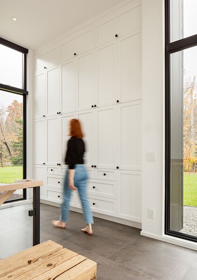 La maison a été complètement ouverte sur son environnement afin d’offrir un espace de vie inondé de lumière naturelle. La terrasse existante face au lac a été convertie en un espace intérieur où a été aménagée la salle à manger. À l’inverse, le versant principal de la toiture a été rallongé pour offrir une grande terrasse couverte pouvant être complètement refermée par des stores moustiquaires amovibles. Afin de libérer l’espace de vie principal, la circulation verticale de la maison a été déplacée dans un nouveau volume à l’avant de la maison. Ce volume accueille ses occupants par un vestibule monumental avec une hauteur de plafond de 12 pieds, par où on peut apercevoir les autres pavillons du terrain.