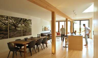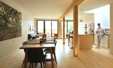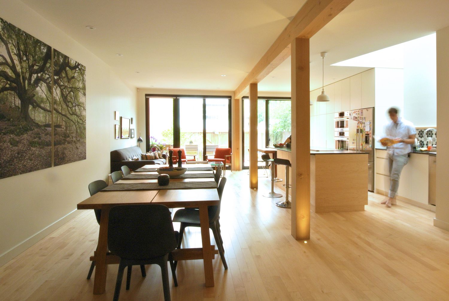 Translation est la conversion d’un duplex situé sur le Plateau Mont-Royal en une maison unifamiliale. Les cloisons du rez-de-chaussée ont été complètement ouvertes pour aménager les espaces de vie familiaux. La façade arrière a été complètement fenestrée pour inonder le rez-de-chaussée de lumière. Un espace salon prend place à l’avant de la maison avec une cloison amovible pour augmenter son intimité face à ce grand espace, au besoin. À l’étage, quatre chambres ont été aménagées dont une chambre principale avec salle de bain attenante. D’un geste angulaire, un percement a été créer au niveau de l’étage à l’arrière de l’escalier pour acheminer la lumière d’un puit de lumière jusqu’à la cuisine du rez-de-chaussée. Ce geste, accompagné d’un deuxième puit de lumière au-dessus de l’escalier, mets en scène par une lumière abondante ce lieu de déplacement quotidien.