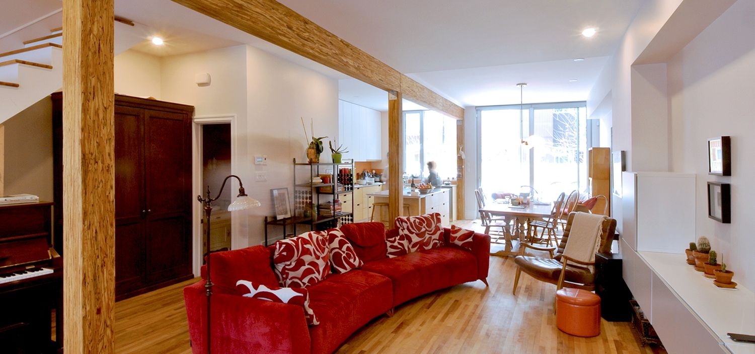 4Rooms est une transformation de duplex en maison unifamiliale pour une famille sur le Plateau Mont-Royal. Le défi du projet est d’aménager quatre chambres à l’étage pour accueillir ses occupants dans un bâtiment de 20′ de large. Le rez-de-chaussée est libéré de toutes ses cloisons par un ensemble de poutres et de colonnes exposées en PSL pour créer une grande aire de vie claire et colorée comprenant cuisine, salle à manger, salon et espace piano. La cour extérieure est aménagée en continuité à ce grand espace chaleureux par le percement de grandes ouvertures intégrées à la nouvelle façade arrière. La façade avant, quant à elle, conserve ses caractéristiques d’origine. À l’étage, les espaces comportent une atmosphère douce et intime. Chambres, espace bureau et salle de bain bénéficient tous d’un éclairage naturel abondant dans une configuration généreuse et fonctionnelle.