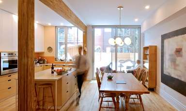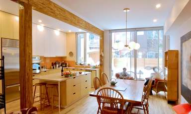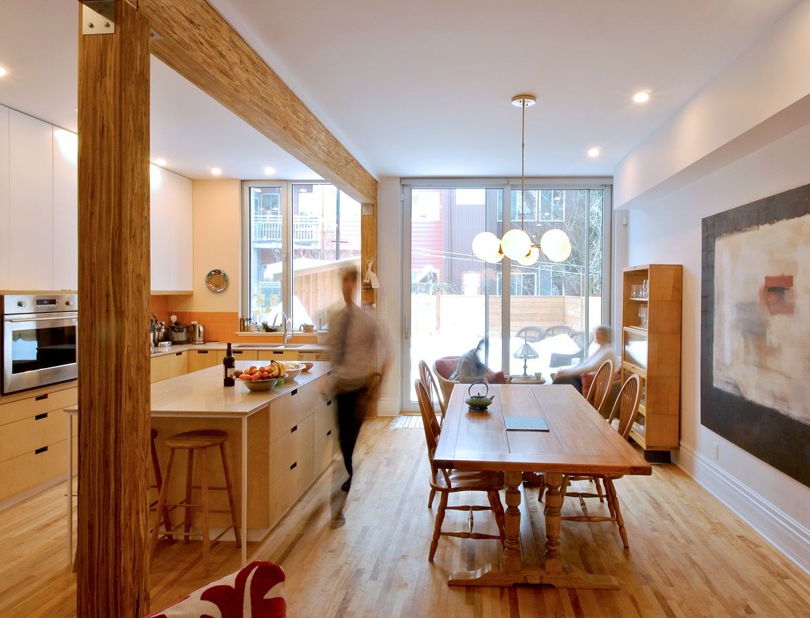 4Rooms est une transformation de duplex en maison unifamiliale pour une famille sur le Plateau Mont-Royal. Le défi du projet est d’aménager quatre chambres à l’étage pour accueillir ses occupants dans un bâtiment de 20′ de large. Le rez-de-chaussée est libéré de toutes ses cloisons par un ensemble de poutres et de colonnes exposées en PSL pour créer une grande aire de vie claire et colorée comprenant cuisine, salle à manger, salon et espace piano. La cour extérieure est aménagée en continuité à ce grand espace chaleureux par le percement de grandes ouvertures intégrées à la nouvelle façade arrière. La façade avant, quant à elle, conserve ses caractéristiques d’origine. À l’étage, les espaces comportent une atmosphère douce et intime. Chambres, espace bureau et salle de bain bénéficient tous d’un éclairage naturel abondant dans une configuration généreuse et fonctionnelle.