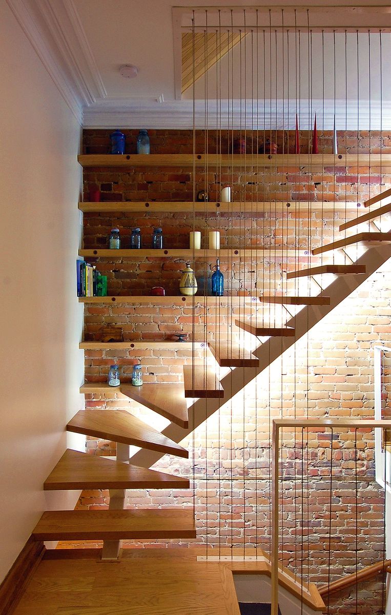 Cet accès au toit est développé à la manière d’une embrasure au plafond de la pièce centrale d’un logement, cadrant des vues directes au ciel. Cette mince ouverture permet désormais de faire pénétrer une grande quantité de lumière et de clarté dans la salle à manger et l’espace de circulation central, très sombres avant les travaux. Un nouvel escalier ajouré à limon central et marches de chêne massif prolonge l’escalier original vers la nouvelle sortie au toit en longeant un mur de brique existant mis en valeur par la légèreté de cet ajout intérieur contemporain. Dans une approche d’intervention respectueuse de l’existant, les moulures et ornements de plafond originaux ont été modifiés afin de s'intégrer à la nouvelle conception. L’escalier se termine sur un espace de lecture clair et généreux malgré les contraintes de superficie de la municipalité pour les accès au toit (15m²). Cet espace s’ouvre sur une terrasse au toit et sur un panorama allant du stade olympique au Mont-Royal. Quelques années plus tard, une addition au projet d'une pergola en acier a été conçue par Studio MMA pour offrir plus d'intimité et de protection solaire.
