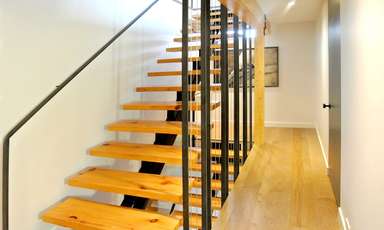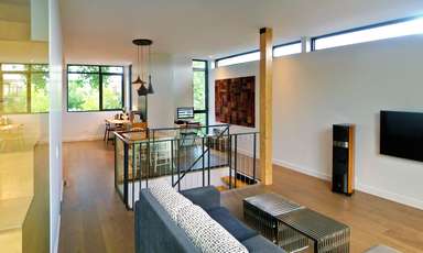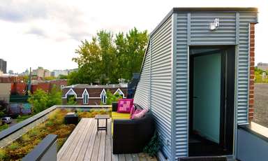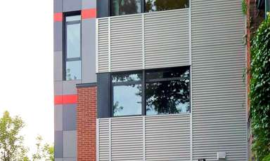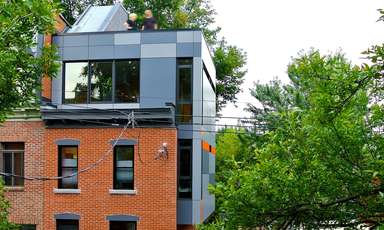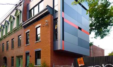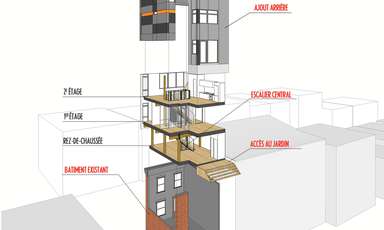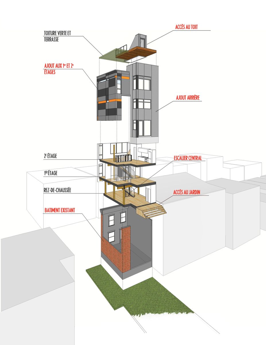 Ce projet d’ajout est développé sur un petit cottage de deux étages datant du début du dernier siècle, comportant plusieurs composantes caractéristiques des bâtiments de l’époque. La conception d’ajouts au troisième étage, sur le côté et à l’arrière de la maison, visent à mettre en valeur ces composantes historiques tout en dotant les ajouts d’une identité moderne en dialogue avec le bâtiment d’origine. La palette des matériaux choisis pour les ajouts met en relief la tension historique entre existant et nouveau par l’utilisation d’un revêtement d’acier de teinte charbon ayant comme fond la brique rouge d’origine du cottage. L’aménagement intérieur des 3 niveaux se définit autour d’un escalier central qui par sa position ordonne spontanément les fonctions des aires de planchers et rythme la façade latérale. Les composantes structurales requises pour ces ajouts sont exposées et renforcent à leur tour la définition des espaces intérieurs. En contraste avec les espaces existants de la maison qui étaient peu éclairés, les ajouts assurent un approvisionnement généreux en clarté de tous les espaces et permettent la création d’ouvertures qui cadrent des vues sur le Mont-Royal.