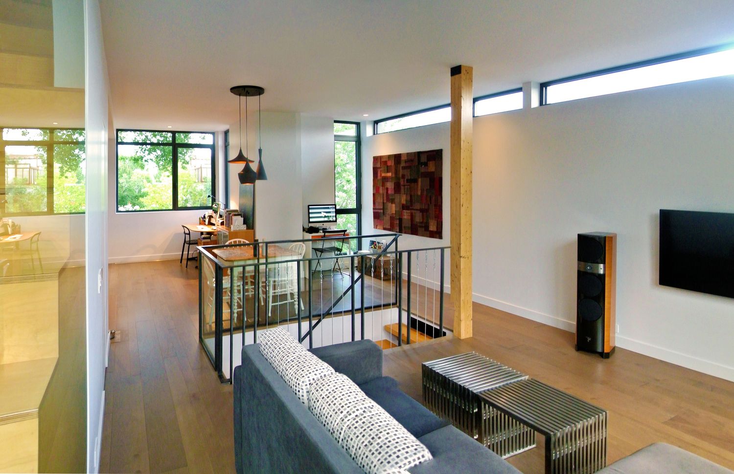 Ce projet d’ajout est développé sur un petit cottage de deux étages datant du début du dernier siècle, comportant plusieurs composantes caractéristiques des bâtiments de l’époque. La conception d’ajouts au troisième étage, sur le côté et à l’arrière de la maison, visent à mettre en valeur ces composantes historiques tout en dotant les ajouts d’une identité moderne en dialogue avec le bâtiment d’origine. La palette des matériaux choisis pour les ajouts met en relief la tension historique entre existant et nouveau par l’utilisation d’un revêtement d’acier de teinte charbon ayant comme fond la brique rouge d’origine du cottage. L’aménagement intérieur des 3 niveaux se définit autour d’un escalier central qui par sa position ordonne spontanément les fonctions des aires de planchers et rythme la façade latérale. Les composantes structurales requises pour ces ajouts sont exposées et renforcent à leur tour la définition des espaces intérieurs. En contraste avec les espaces existants de la maison qui étaient peu éclairés, les ajouts assurent un approvisionnement généreux en clarté de tous les espaces et permettent la création d’ouvertures qui cadrent des vues sur le Mont-Royal.