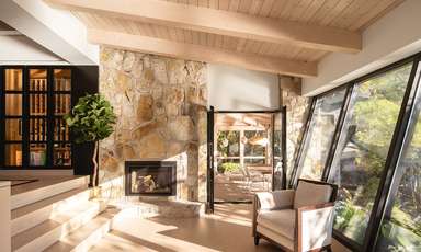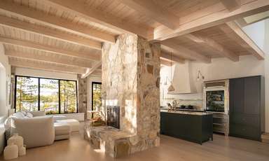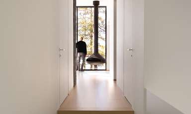 La pierre et le bois massif sont utilisés aussi à l’intérieur, en ton sur ton. Les autres surfaces sont principalement blanches ou claires, maximisant ainsi la lumière et mettant en valeur les couleurs de la nature environnante.