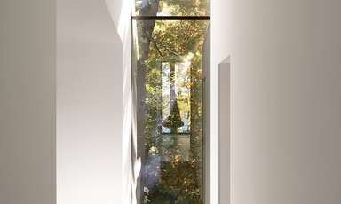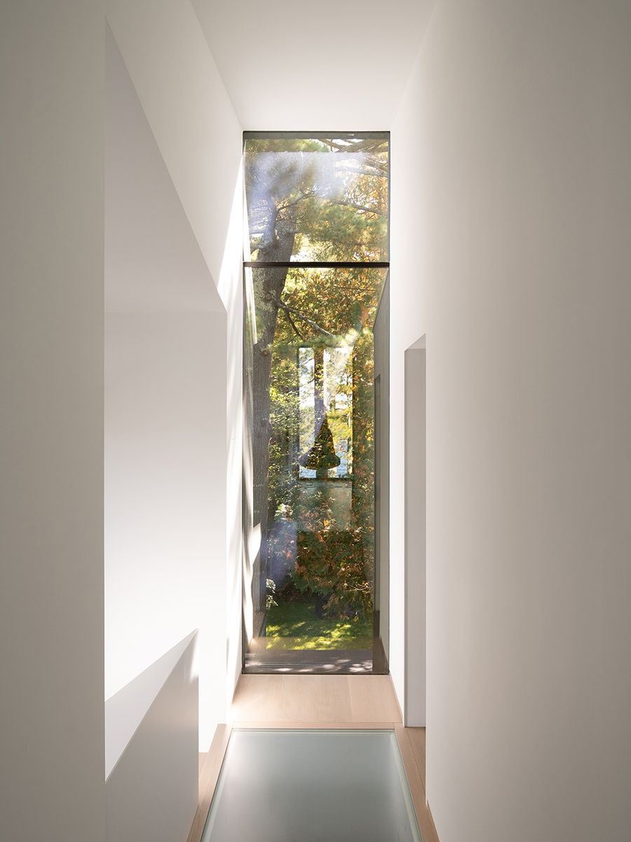 L’ajout sur le toit sert aussi à éclairer le rez-de-chaussée. Par une grande ouverture verticale du côté est, à l’étage, la lumière du matin entre à l’intérieur et filtre jusqu’au rez-de-chaussée à travers le plancher de la passerelle fait de verre translucide. Ainsi, le cœur du chalet au rez-de-chaussée, qui normalement serait plus sombre, se trouve illuminé de lumière naturelle. Une grande fenêtre en haut de l’escalier joue aussi ce rôle de puits de lumière et offre une vue vers le ciel alors que l’on monte à l’étage.