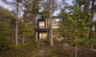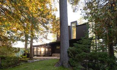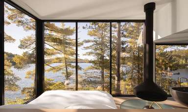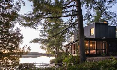 Les clients sont propriétaires de ce chalet en bois rond qui appartenait à la famille depuis 40 ans. Celui-ci est ancré sur une pointe rocheuse qui s’avance dans le lac. On y est entouré d’eau sur trois côtés.