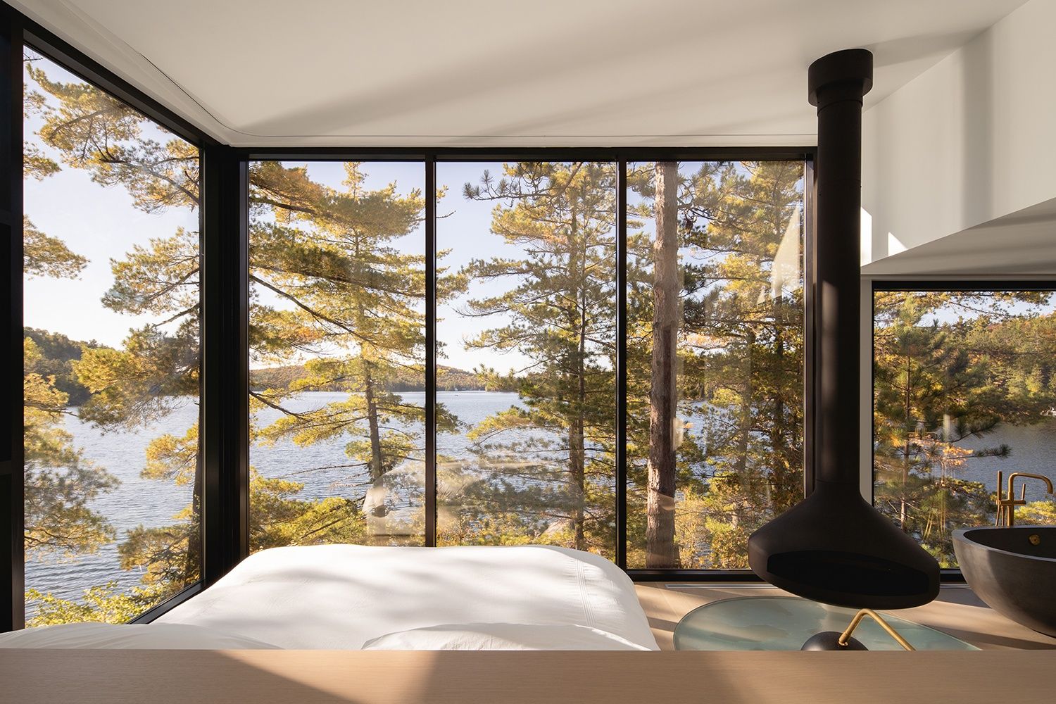 Le fait d’ajouter un étage présentait un avantage important que les clients et l’architecte pouvaient constater lors de la conception en montant sur le toit de l’ancien chalet. Ce promontoire offrait une vue exceptionnelle sur le lac et une ouverture sur le ciel que l’on n’avait pas au rez-de-chaussée. Ce poste d’observation a été donné à la chambre principale. De leur lit, les clients ont une vue imprenable sur la pointe avec ces beaux grands pins, sur le lac ainsi que sur le ciel de nuit étoilé.