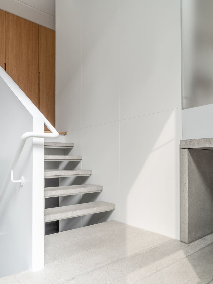 Matérialité Un grand soin est porté aux détails et aux choix des matières. Dans ce projet, le chêne blanc, le béton poli et les panneaux laqués blanc ou anthracite sont les principaux matériaux utilisés.      Une continuité des matières à travers la maison contribue, elle aussi, à une impression de fluidité entre les espaces. Le grand volume en panneaux de chêne blanc, qui borde le corridor au rez-de-chaussée, tourne dans l’aire de vie et devient un rangement de service pour la table à manger. De la même façon, les panneaux laqués blanc du mobilier intégré de la cuisine deviennent le revêtement des murs du puits d’escalier et descendent jusqu’au sous-sol.     D’autres matériaux viennent s’ajouter à la palette du projet comme les appareils d’éclairage en laiton ou la mosaïque de marbre de Carrare qui recouvre les surfaces de la salle de bain du rez-de-chaussée.     Le béton poli se retrouve, lui aussi, à plusieurs endroits dans le projet. On l’utilise en dalle réalisée sur place mais aussi en éléments coulés et polis en atelier pour en faire des panneaux muraux ainsi que des marches et paliers d’escalier.     Dans la salle de bain du sous-sol, ces panneaux muraux de béton poli sont aussi utilisés, comme si le sol remontait sur les murs. La salle de bain est visuellement scindée en deux : la zone sèche en béton avec sa vanité en chêne blanc, et la zone humide recouverte de petites tuiles de céramique blanche.