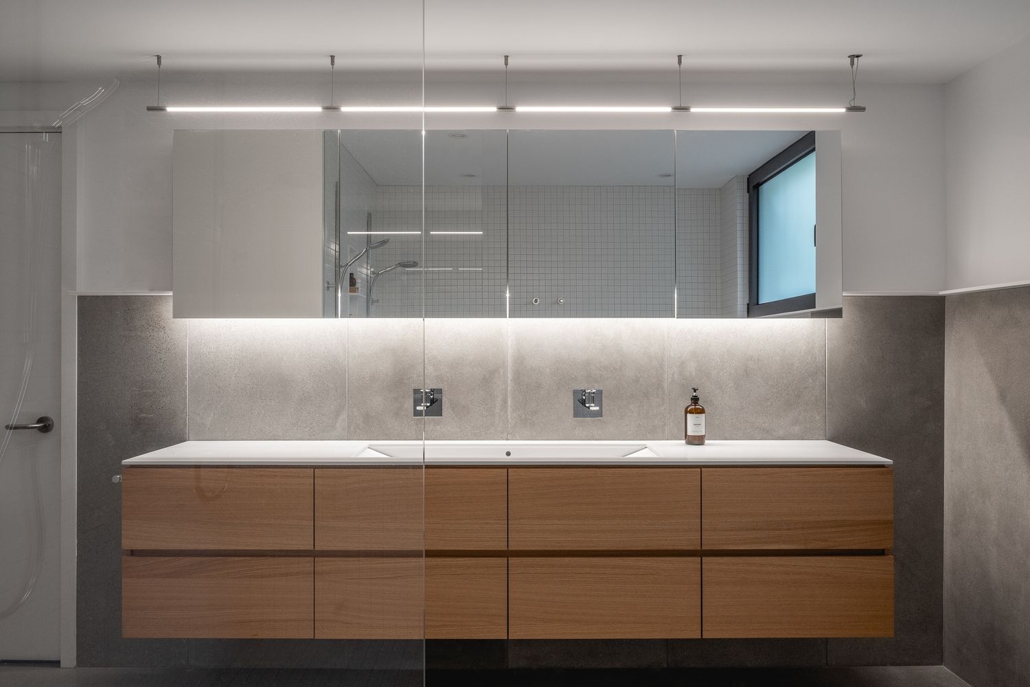 Matérialité Un grand soin est porté aux détails et aux choix des matières. Dans ce projet, le chêne blanc, le béton poli et les panneaux laqués blanc ou anthracite sont les principaux matériaux utilisés.      Une continuité des matières à travers la maison contribue, elle aussi, à une impression de fluidité entre les espaces. Le grand volume en panneaux de chêne blanc, qui borde le corridor au rez-de-chaussée, tourne dans l’aire de vie et devient un rangement de service pour la table à manger. De la même façon, les panneaux laqués blanc du mobilier intégré de la cuisine deviennent le revêtement des murs du puits d’escalier et descendent jusqu’au sous-sol.     D’autres matériaux viennent s’ajouter à la palette du projet comme les appareils d’éclairage en laiton ou la mosaïque de marbre de Carrare qui recouvre les surfaces de la salle de bain du rez-de-chaussée.     Le béton poli se retrouve, lui aussi, à plusieurs endroits dans le projet. On l’utilise en dalle réalisée sur place mais aussi en éléments coulés et polis en atelier pour en faire des panneaux muraux ainsi que des marches et paliers d’escalier.     Dans la salle de bain du sous-sol, ces panneaux muraux de béton poli sont aussi utilisés, comme si le sol remontait sur les murs. La salle de bain est visuellement scindée en deux : la zone sèche en béton avec sa vanité en chêne blanc, et la zone humide recouverte de petites tuiles de céramique blanche.