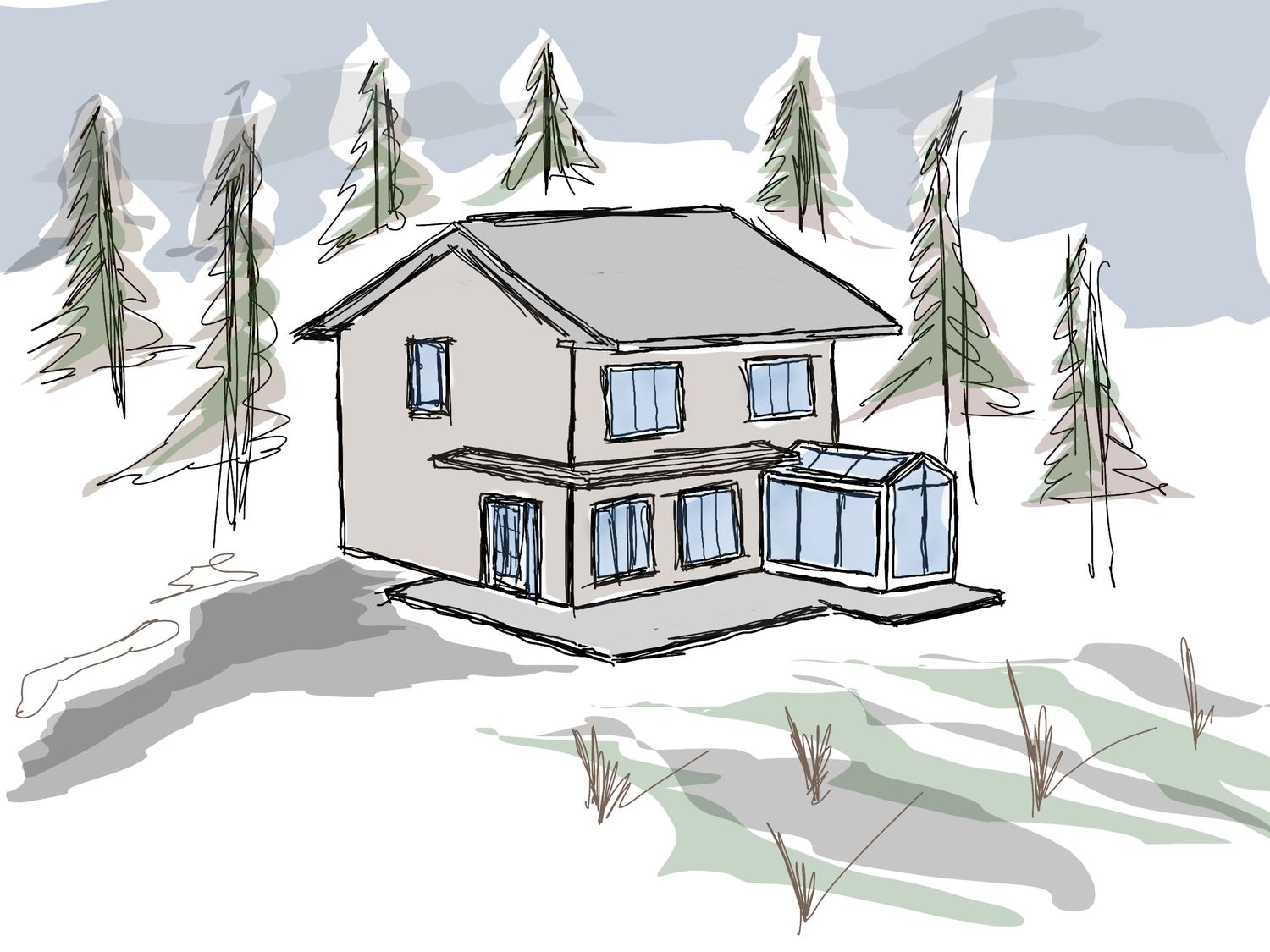 Conception walk out sur un terrain favorable avec serre Recherches associées Rendu 3D Gatineau (Outaouais) Concept Conception Plan Design