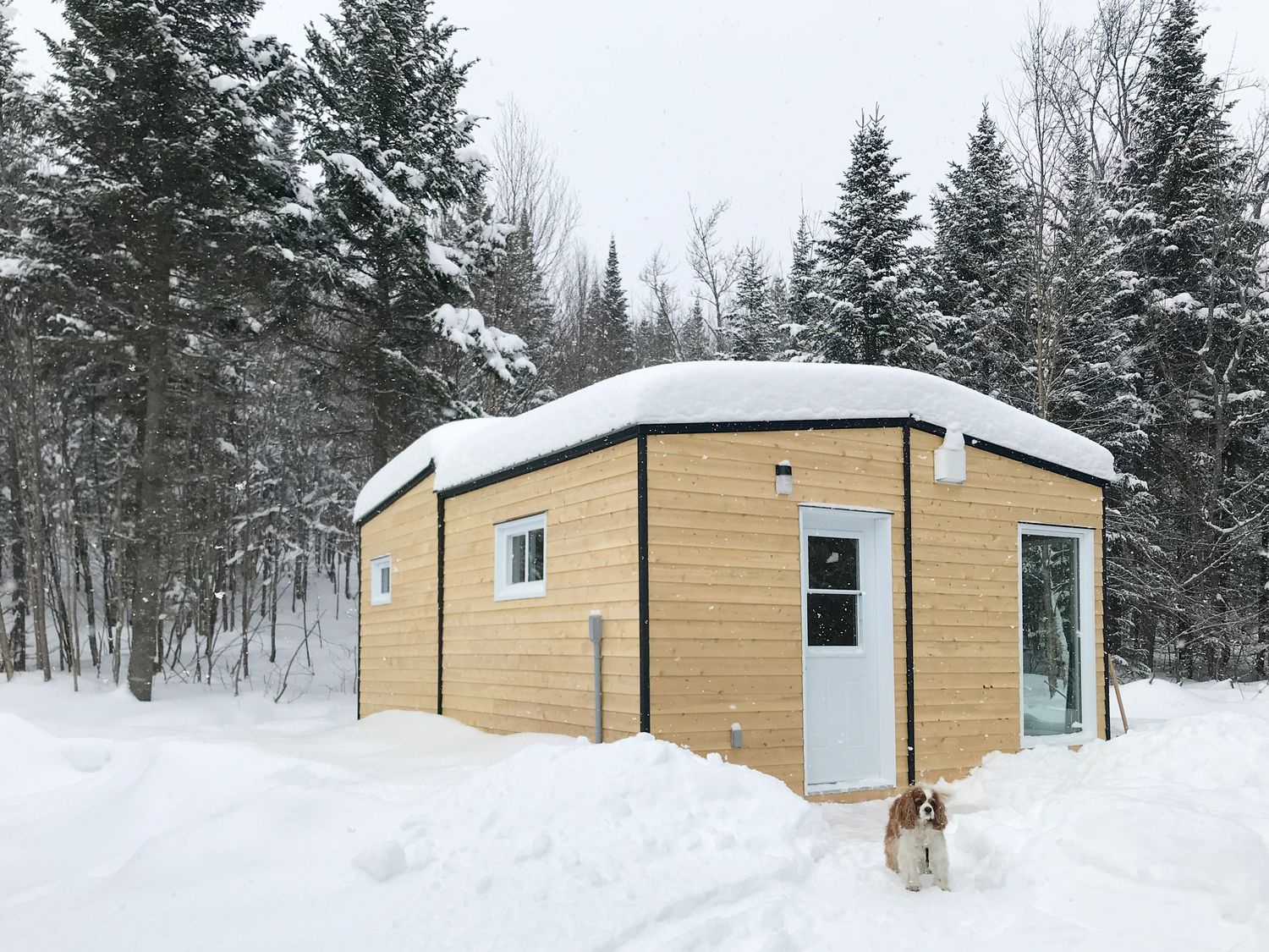 Chalet modulaire construit en atelier, déplacé puis assemblé sur place avec l'aide d'un entrepreneur local. Au préalable, le terrain a été nivelé et une bonne couche de gravier a été disposée au sol par les propriétaires. Les trois modules ont pu être installés directement au sol grâce à leur base en poutre d'acier.