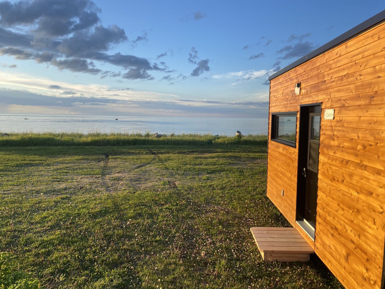 Micro-maison destinée à la location. La micro a été conçue dans une coquille TOUNDRÄ de 8'x16' et inclut tout le nécessaire pour accueillir confortablement jusqu'à 6 personnes. De par ses dimensions et son poids léger, celle-ci peut être installée presque partout. Par exemple, l'une d'entre elles avait été installée aux abords d'une scène extérieure sur le barachois de Matane. Les occupants ont pu profiter des couchers de soleil et de la vue du fleuve confortablement à l'abri du vent.