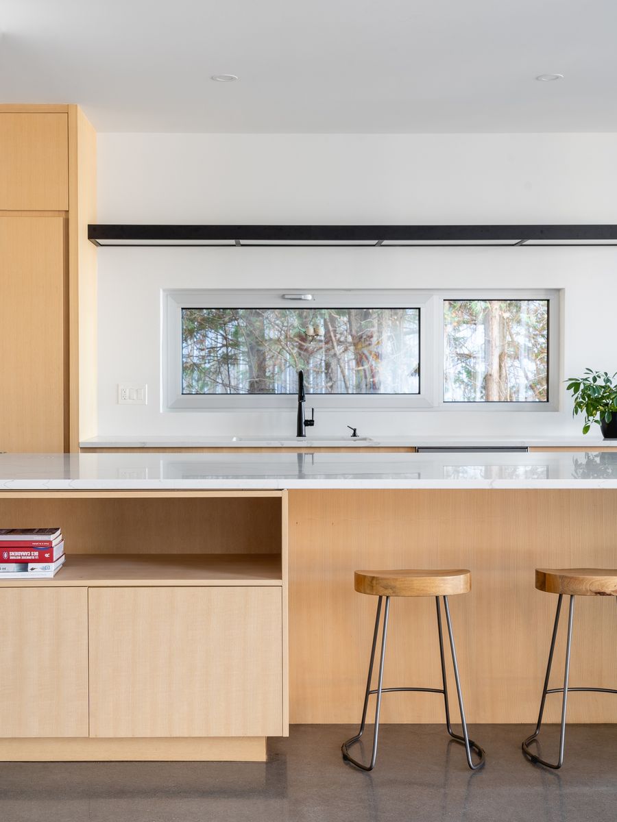 Dès l’entrée côté chemin, l’espace s’ouvre sur le lac et sa plage. Au rez-de-chaussée, le côté ouest est occupé par la cuisine, dont l’îlot traverse l’espace et se termine sur un salon de lecture profitant du soleil matinal. Côté lac, le foyer de masse de pierre ansa, qui s’élève dans la double hauteur, est le point focal de l’aire ouverte. Cette pièce centrale, complètement vitrée, s’ouvre sur la grande terrasse et sur le tableau en constante évolution du lac Simon. Derrière le foyer, l’escalier aux marches flottantes donne accès aux passerelles de l’étage. Composées d’une structure d’acier brut surmontée de lattes de bois de drave récupéré au fond du lac, elles donnent accès aux chambres et à l’atelier de peinture.