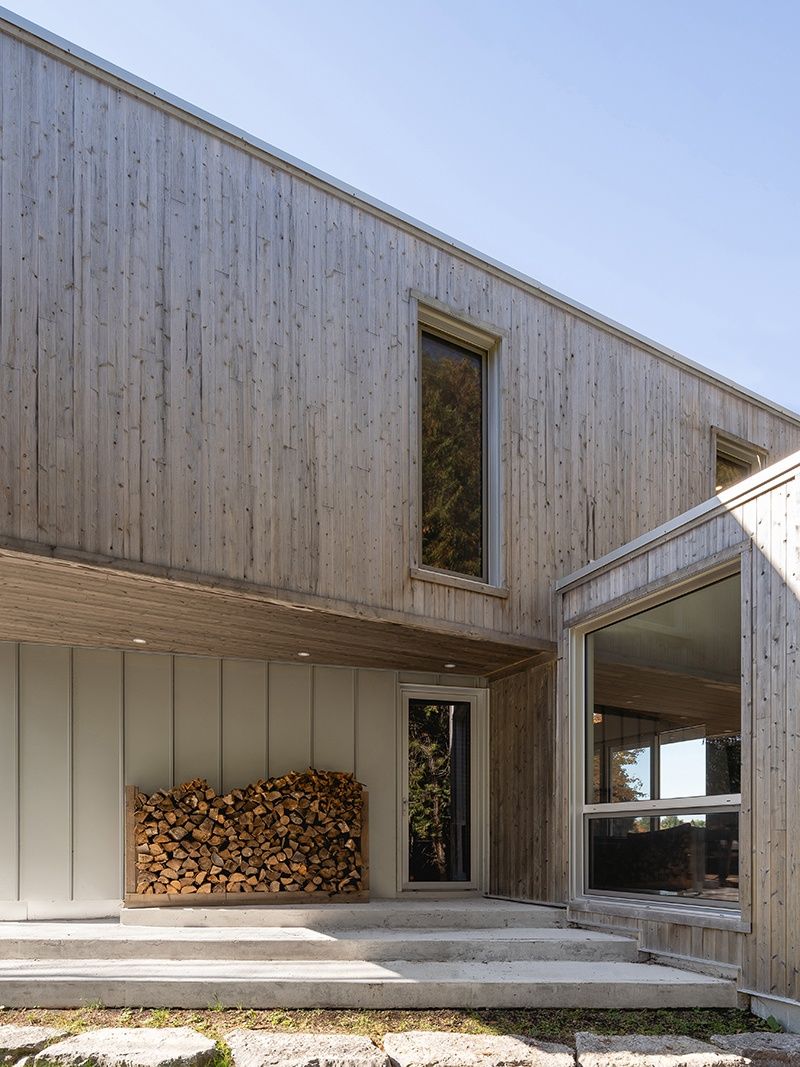 La maison Baie-Yelle est une résidence principale de 5400 pi2 construite sur les berges du Lac Simon, en Outaouais, imaginée pour accueillir une famille de six personnes. Bâtie pour remplacer le chalet familial, le projet est dessiné en dialogue avec le lac tranquille et la nature environnante.