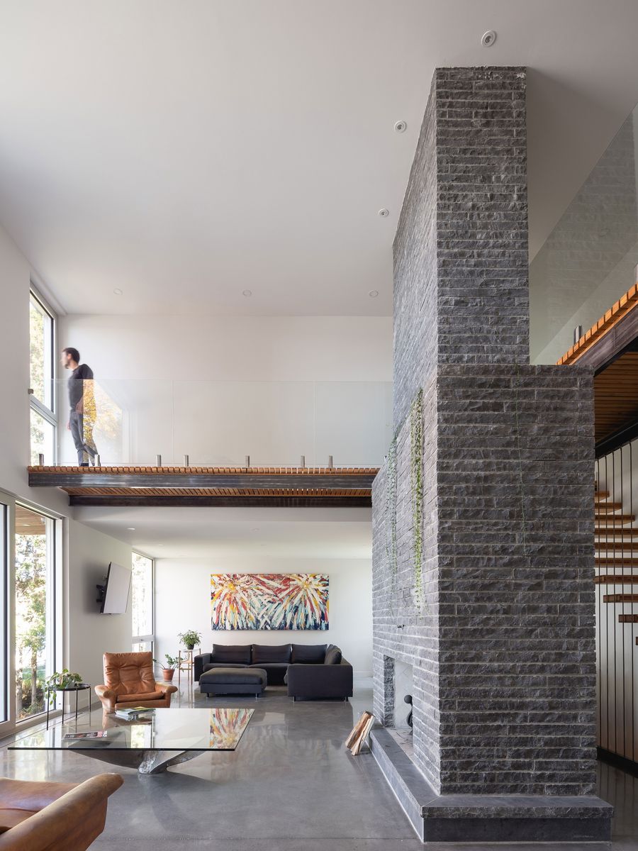 Dès l’entrée côté chemin, l’espace s’ouvre sur le lac et sa plage. Au rez-de-chaussée, le côté ouest est occupé par la cuisine, dont l’îlot traverse l’espace et se termine sur un salon de lecture profitant du soleil matinal. Côté lac, le foyer de masse de pierre ansa, qui s’élève dans la double hauteur, est le point focal de l’aire ouverte. Cette pièce centrale, complètement vitrée, s’ouvre sur la grande terrasse et sur le tableau en constante évolution du lac Simon. Derrière le foyer, l’escalier aux marches flottantes donne accès aux passerelles de l’étage. Composées d’une structure d’acier brut surmontée de lattes de bois de drave récupéré au fond du lac, elles donnent accès aux chambres et à l’atelier de peinture.