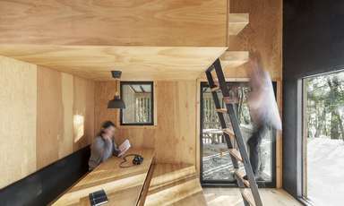 Un petit sentier qui sillonne à travers la forêt mène au microrefuge, situé à une dizaine de minutes de marche du pavillon d’accueil. L’accès au bâtiment se fait par la terrasse couverte. Les espaces intérieurs sont sobres et baignés de lumière naturelle. Une cuisinette complète et une table se transformant en lit supplémentaire occupent le premier niveau. Le point focal du refuge est la grande baie vitrée qui offre une vue ininterrompue sur la forêt et le réservoir en contrebas. La chaise hamac, suspendue au plafond, permet de profiter du paysage et de la chaleur du foyer. Une échelle inclinée mène au lit, repère suspendu dans le toit cathédrale par des tirants d’acier. Des panneaux de contreplaqué de sapin recouvrent tous les murs intérieurs, et la structure de pruche de la toiture a été laissée apparente.