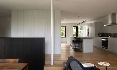 L’espace se structure autour du volume central qui comprend l’escalier, la salle de bain secondaire et le garde-robe de l’entrée. La cuisine linéaire s’insère entre le mur extérieur et le volume central, tandis que le salon et la salle à manger occupent l’agrandissement lumineux, deux marches plus bas. Le mobilier intégré, simple et contrasté, contribue à structurer les espaces.