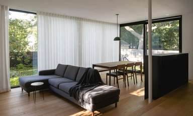 Le crépis et les panneaux d’aluminium blanc utilisés pour les revêtements extérieurs sont sobres et inspirés des matériaux utilisés à l’époque pour la construction de ces maisons ouvrières. La toiture de bardeau d’asphalte laisse place à un toit métallique. Les grandes fenêtres certifiées « maison passive » et orientées franc sud procurent une lumière généreuse et un chauffage passif à longueur d’année.