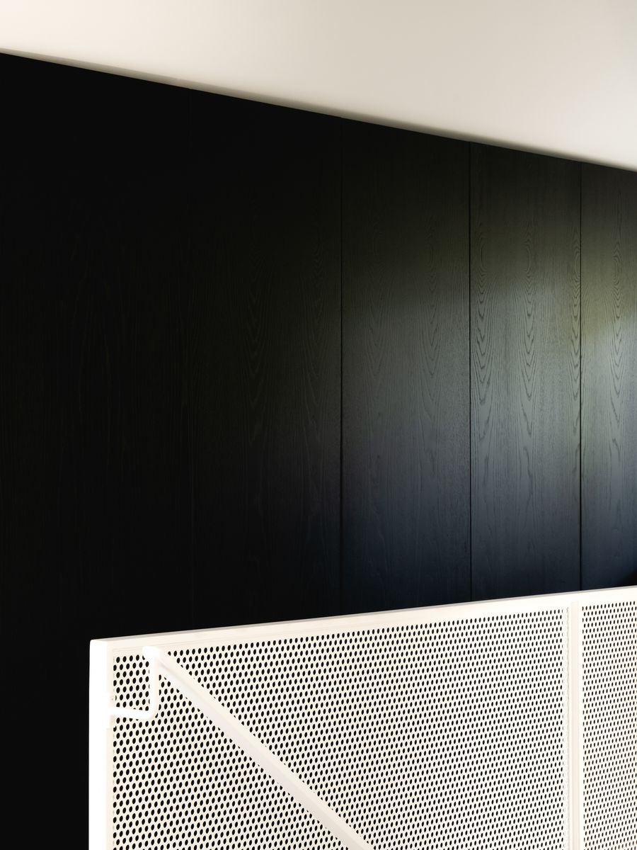 L’espace se structure autour du volume central qui comprend l’escalier, la salle de bain secondaire et le garde-robe de l’entrée. La cuisine linéaire s’insère entre le mur extérieur et le volume central, tandis que le salon et la salle à manger occupent l’agrandissement lumineux, deux marches plus bas. Le mobilier intégré, simple et contrasté, contribue à structurer les espaces.