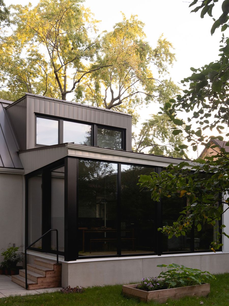 Le crépis et les panneaux d’aluminium blanc utilisés pour les revêtements extérieurs sont sobres et inspirés des matériaux utilisés à l’époque pour la construction de ces maisons ouvrières. La toiture de bardeau d’asphalte laisse place à un toit métallique. Les grandes fenêtres certifiées « maison passive » et orientées franc sud procurent une lumière généreuse et un chauffage passif à longueur d’année.
