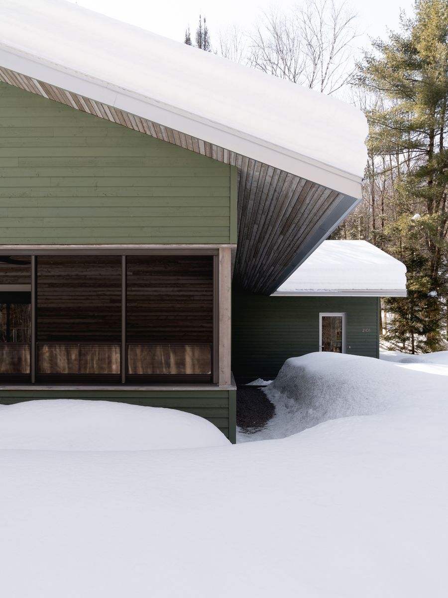 Le revêtement extérieur, en bardage horizontal de pin vert forêt, renforce la linéarité du plan et camoufle le projet dans son contexte forestier. Le grand toit à pente faible recouvert de tôle métallique à joints debout crée avec ses larges débords une protection efficace contre la surchauffe solaire et les intempéries. Les cavités de l’ossature de bois en 2x8 et la toiture de la maison sont remplies de fibre cellulosique, tandis que la structure est recouverte de panneaux de fibre de bois, conférant à la maison une performance énergétique supérieure et une isolation entièrement bio-sourcée. Témoin de l’efficacité de son enveloppe, le bas chalet revêt l’hiver un impressionnant manteau de neige, se fondant encore d’avantage au territoire sauvage.