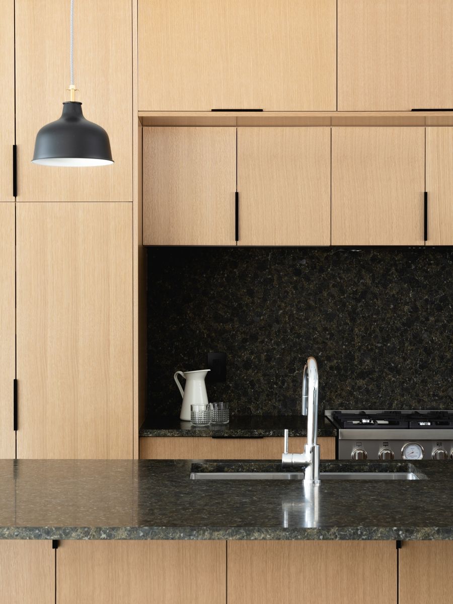 Le revêtement extérieur, en bardage horizontal de pin vert forêt, renforce la linéarité du plan et camoufle le projet dans son contexte forestier. Le grand toit à pente faible recouvert de tôle métallique à joints debout crée avec ses larges débords une protection efficace contre la surchauffe solaire et les intempéries. Les cavités de l’ossature de bois en 2x8 et la toiture de la maison sont remplies de fibre cellulosique, tandis que la structure est recouverte de panneaux de fibre de bois, conférant à la maison une performance énergétique supérieure et une isolation entièrement bio-sourcée. Témoin de l’efficacité de son enveloppe, le bas chalet revêt l’hiver un impressionnant manteau de neige, se fondant encore d’avantage au territoire sauvage.