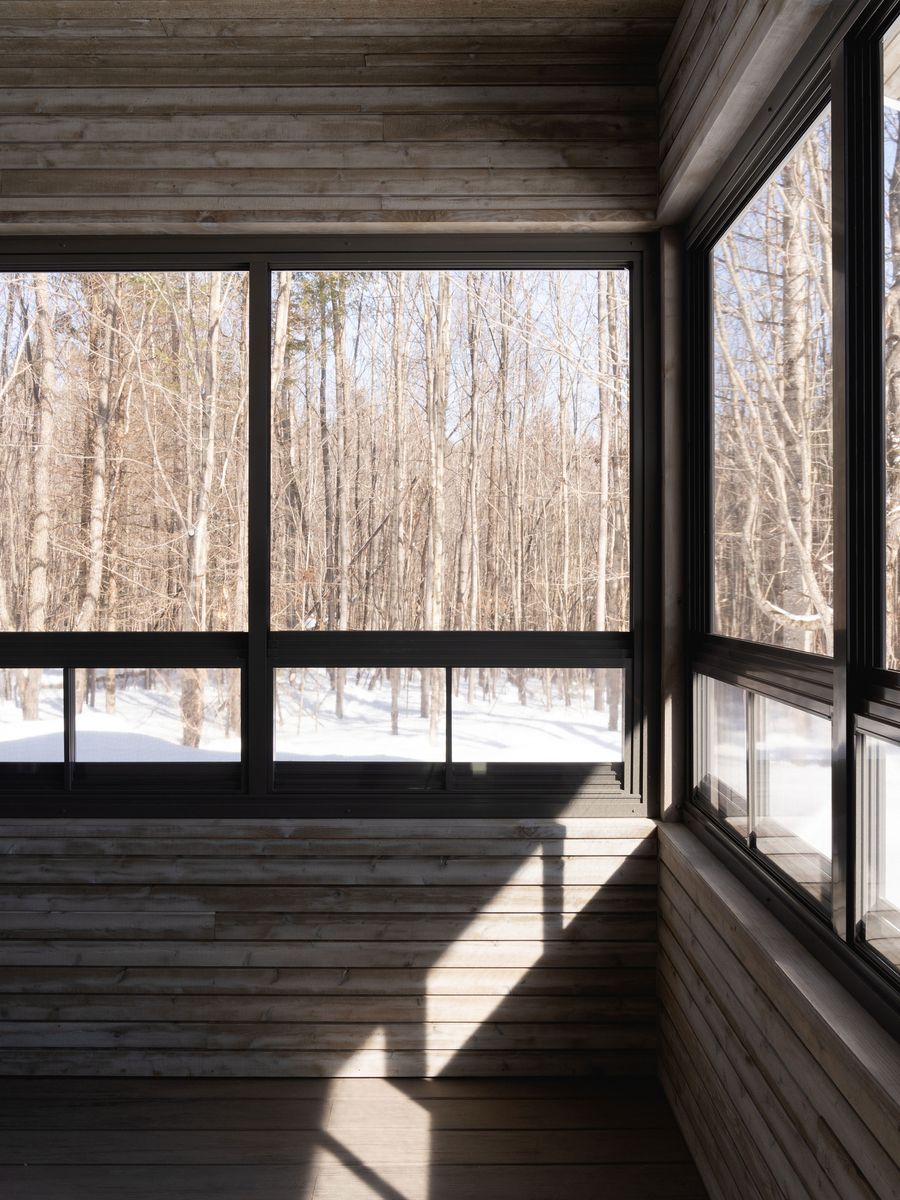 Le projet Mont-Sauvage surplombe une petite rivière au creux d’un boisé à Sainte-Adèle. Évoquant les pavillons de camps des Laurentides, le chalet de 1800pi2 est construit de plain-pied et s’intègre discrètement dans le paysage sylvestre. Son plan en T sépare l’aile de nuit des espaces de jour qui s’ouvrent vers l’arrière du terrain. Le salon, la salle à manger et la cuisine s’organisent autour du foyer central de l’aire ouverte. Habillée de planches de cèdre, la véranda trois-saisons prolonge l’axe principal vers la lisière du bois.