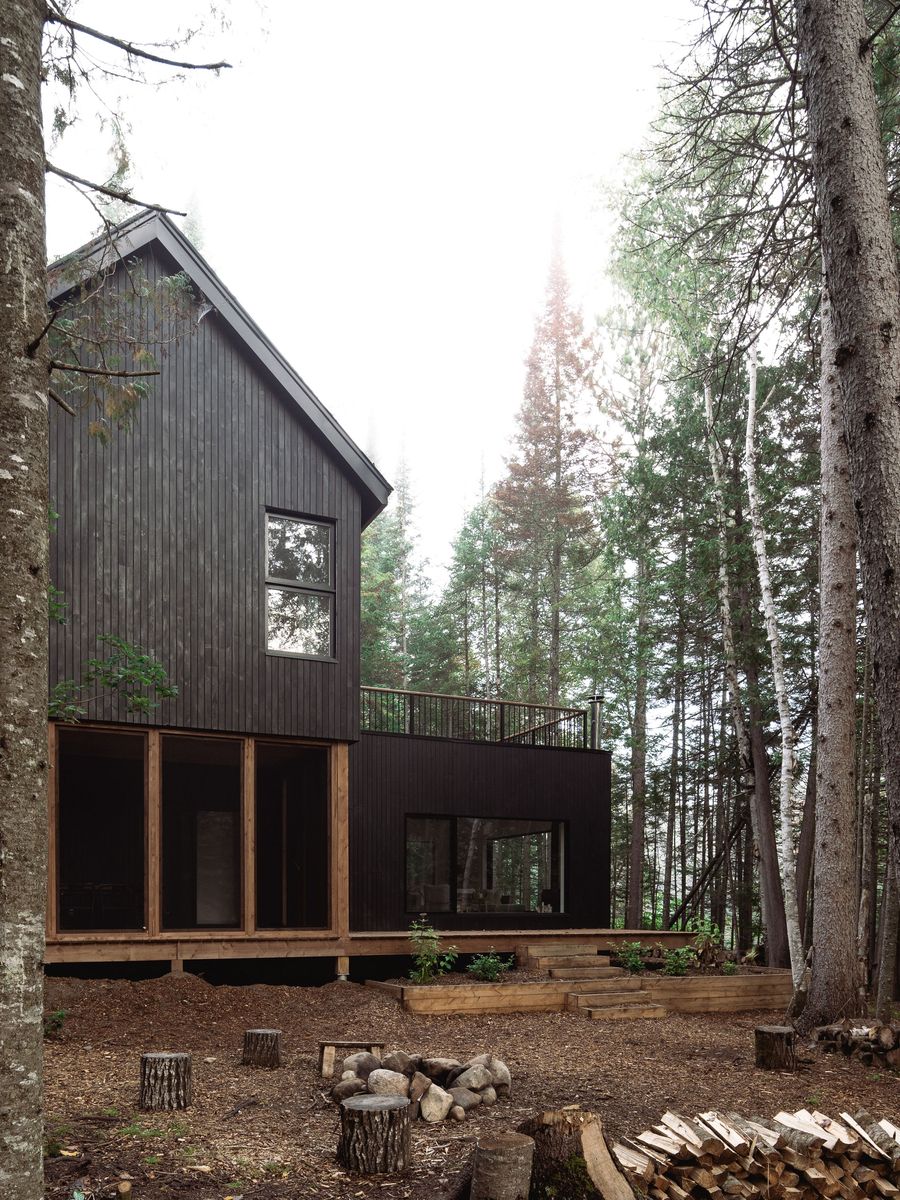 Grâce à son revêtement sobre en bois brûlé, la résidence se fond dans le boisé dense et minimise son empreinte au sol par son implantation plutôt compacte et sa construction sur pilotis. Les pieux vissés, le toit à deux versants et les colonnes de la terrasse protégée renforcent le caractère élancé de la maison et lui confèrent une impression de grandeur malgré une superficie modeste de 1100 pi2.