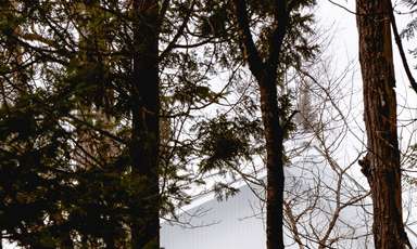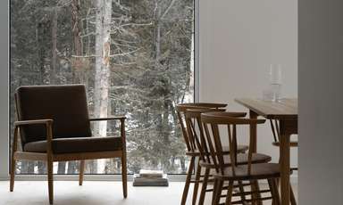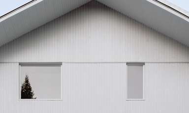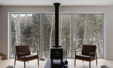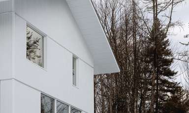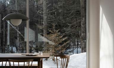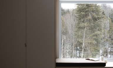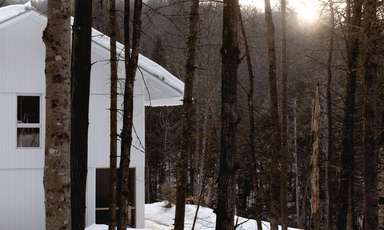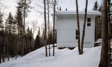 Le revêtement en bois peint blanc, installé à la verticale, camoufle le projet dans le paysage hivernal. Ses subdivisions horizontales rappellent les cabanes alpines traditionnelles, tout comme le toit à pente double avec ses grands débords. L’intérieur se caractérise par une atmosphère calme et chaleureuse. Les grandes baies vitrées laissent place à la contemplation de la nature et aux jeux de lumière. Avec le poêle en son cœur, l’aire commune invite à la détente. Des petits moments complètent le tableau, notamment une niche de lecture dans la chambre principale.