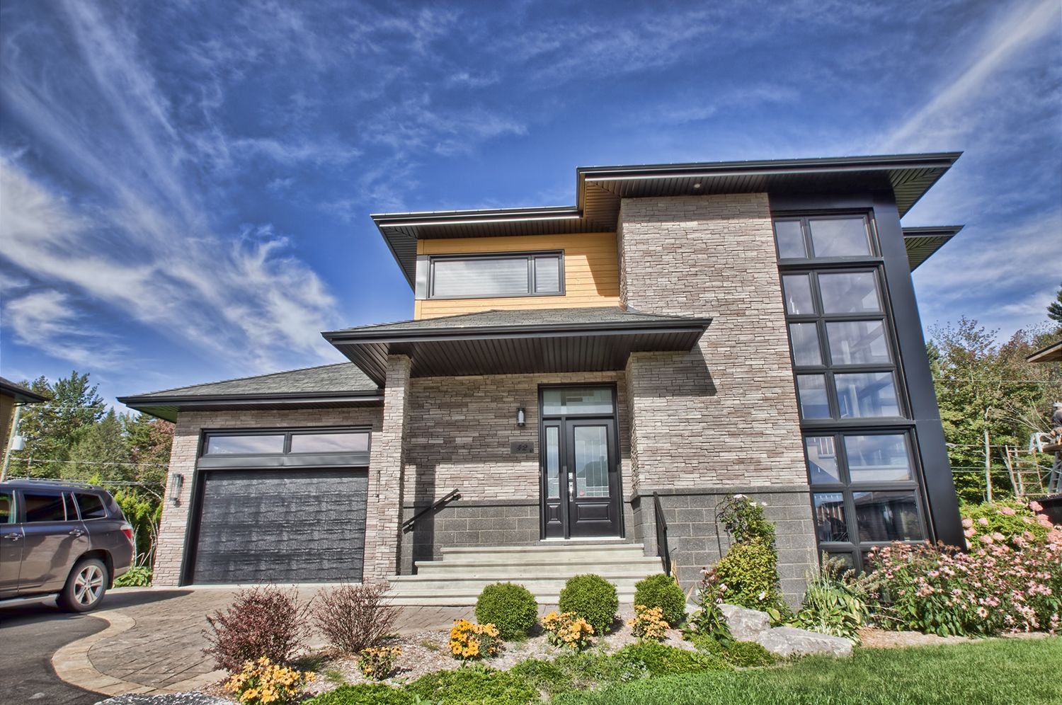 Cette propriété luxueuse inclus un grand garage excavé et un escalier ouvert en bois vue de l’extérieur grâce à sa fenestration prédominante en façade.